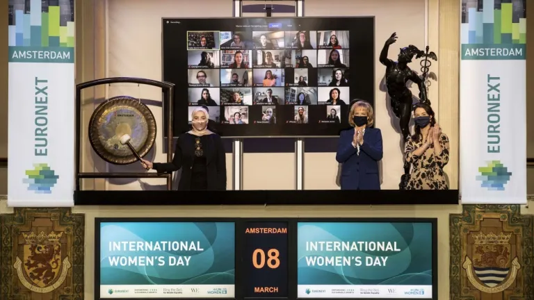 Het is vandaag International Women’s Day! Enaam Ahmed Ali, Board Member van UN Women Nederland, luidde daarom de gong. Dit deed ze samen met Simone Huis in ’t Veld, CEO van Euronext Amsterdam, en Marianne Brackel, commissie lid van Women in ETFs. Het thema van International Women’s Day 2021 is: ‘’Vrouwen in leiderschap: Behalen van een gelijke toekomst in een COVID-19 wereld’’.