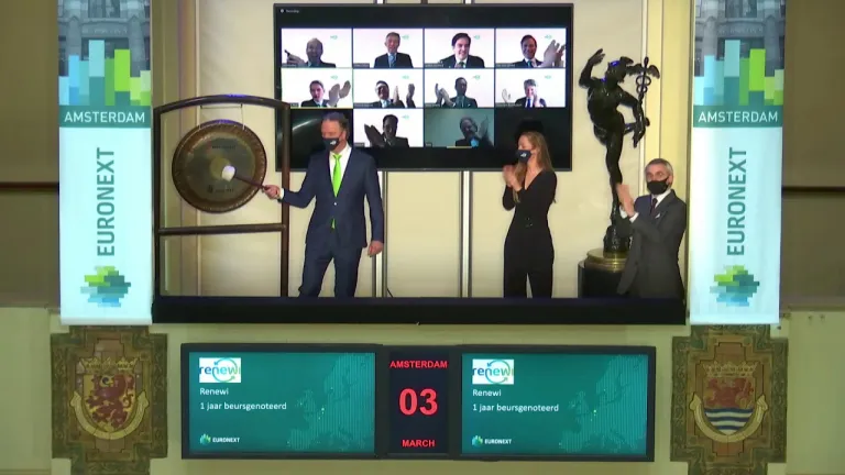 Renewi is 1 jaar genoteerd op Euronext Amsterdam. Om dit bijzondere moment te vieren luidde Otto de Bont, CEO van Renewi, vanochtend de gong. Hij werd hierbij vergezeld door onder andere René van Vlerken, Hoofd Listing van Euronext Amsterdam en Baukje Dreimuller, Legal Counsel van Renewi. Renewi noteerde op 30 januari 2020 succesvol aan de Amsterdamse beurs.
