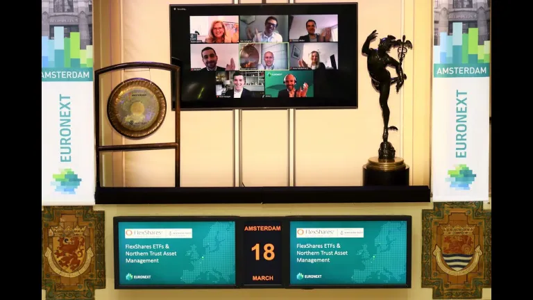 FlexShares ETFs & Northern Trust Asset Management vieren vandaag dat zij 2 ETFs noteren op Euronext. Gerard van Leusden, Hoofd Sales EMEA, luidde virtueel de gong namens Marie Dzanis, EVP, Hoofd Asset Management EMEA van Northern Trust Asset Management, en in het bijzijn van onder meer Brieuc Louchard, verantwoordelijk voor ETFs binnen Euronext.