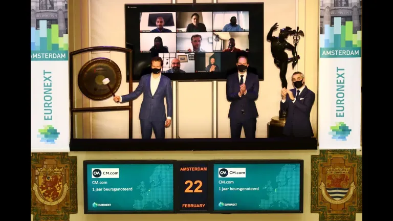 CM.com is 1 jaar genoteerd op Euronext Amsterdam. Om dit bijzondere moment te vieren luidde Gilbert Gooijers, COO van CM.com, vanochtend de gong. Hij werd vergezeld door onder andere René van Vlerken, Hoofd Listing van Euronext Amsterdam. CM.com noteerde vorig jaar succesvol aan de Amsterdamse beurs door middel van een fusie met de Special Purpose Acquisition Company (SPAC) Dutch Star Companies One. Het was de eerste SPAC-notering bij Euronext Amsterdam.