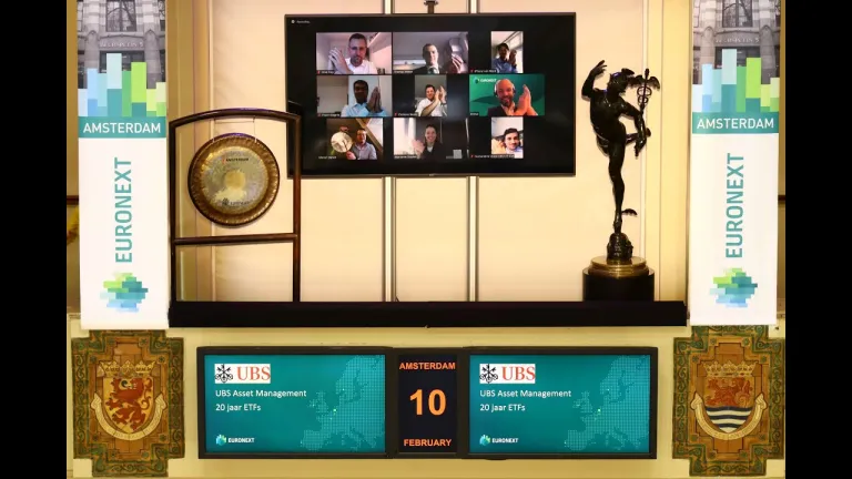 UBS Asset Management vierde vandaag dat zij al twintig jaar ETFs aanbieden. Marcel Danen, Executive Director van UBS, luidde daarom op afstand de gong, in het bijzijn van onder meer Brieuc Louchard, verantwoordelijk voor ETFs binnen Euronext. Tien jaar geleden lanceerde het bedrijf haar eerste duurzame ETF en sinds vijf jaar zijn verschillende ETFs genoteerd aan de Amsterdamse beurs.
