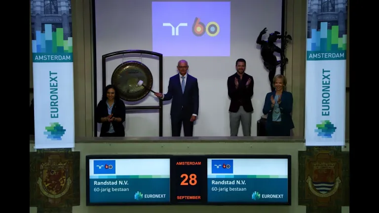 Jacques van den Broek, CEO en Chair van de Executive Board Randstad N.V., werd ontvangen door Simone Huis in ‘t Veld, CEO Euronext Amsterdam, ter viering van het 60-jarig bestaan van Randstad N.V. In de afgelopen 60 jaar is Randstad uitgegroeid van startup tot grootste hr-dienstverlener wereldwijd. Tevens staat Randstad 30 jaar genoteerd op Euronext Amsterdam.