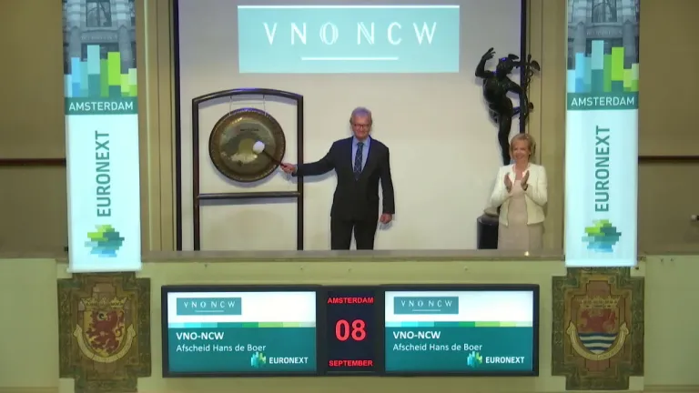 Simone Huis in ’t Veld, CEO Euronext Amsterdam, verwelkomde vandaag Hans de Boer, ter gelegenheid van zijn afscheid als voorzitter van de Vereniging VNO-NCW. De Boer maakte zich de afgelopen zes jaar hard voor een excellent ondernemings- en vestigingsklimaat in Nederland.