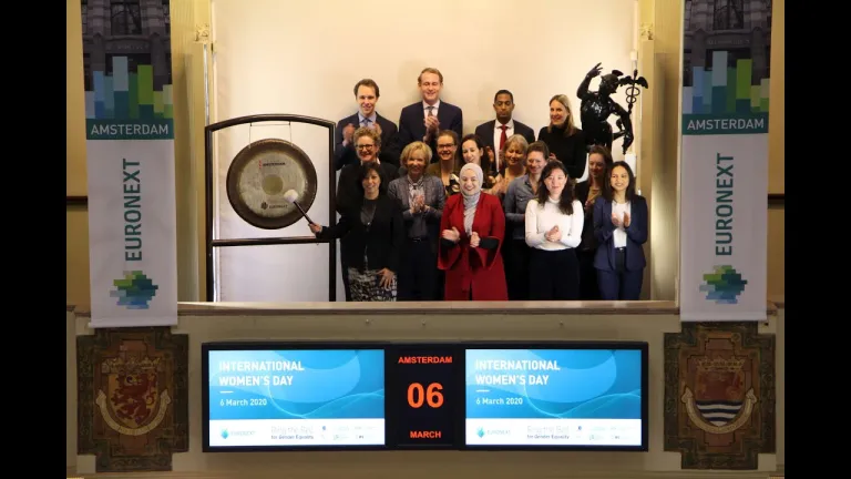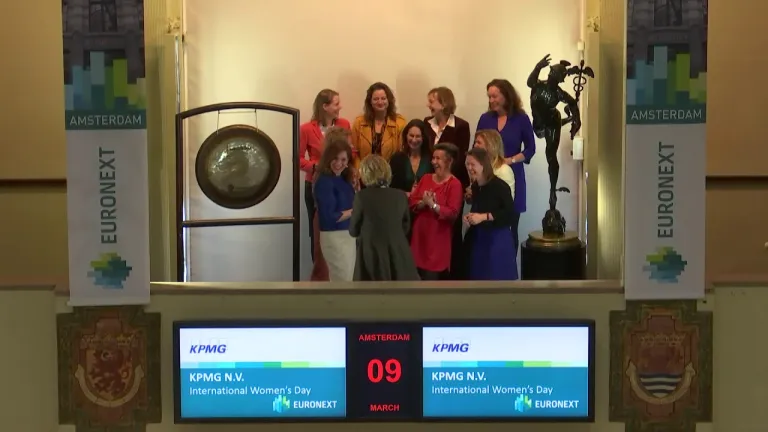 Stephanie Hottenhuis, CEO van KPMG Nederland, heeft de gong geluid samen met vrouwelijke collega’s ter viering van International Women’s Day 2020.