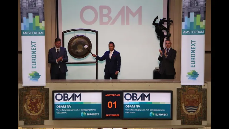 Edwin Simon, Senior Portfolio Manager, luidde de gong en viert hiermee de verzelfstandiging van het beleggingsfonds OBAM N.V.