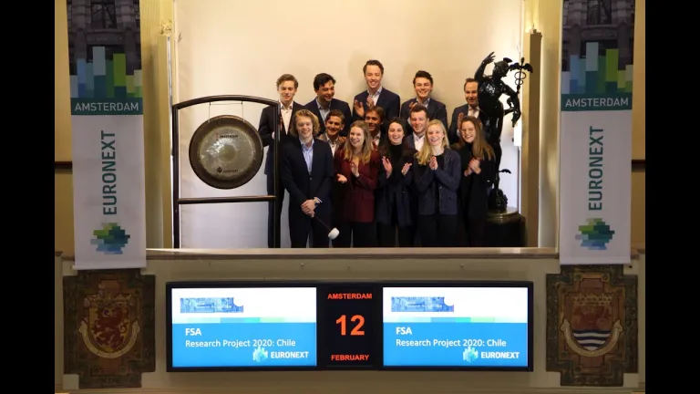 Deelnemer Vincent Kuiper luidde de gong als symbolisch begin van FSA Research Project 2020. 18 Amsterdamse studenten gaan deze zomer onderzoek verrichten naar de mogelijkheden voor Nederlandse bedrijven in Chili.