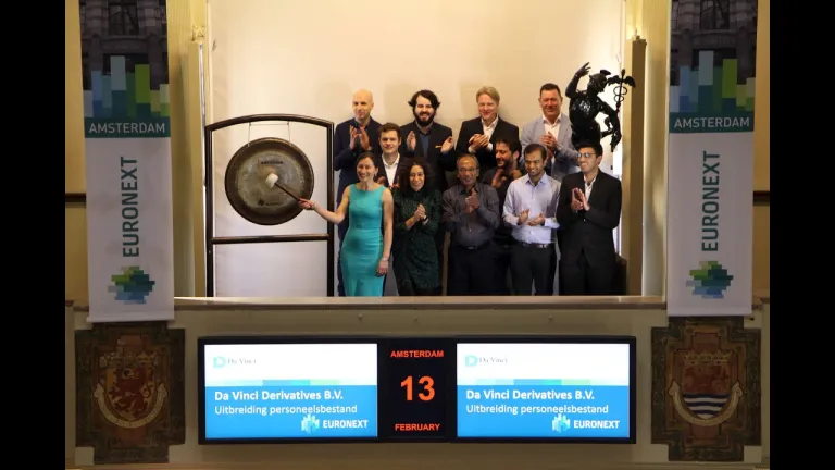 Blerina Anastasi, Head of Legal, Compliance and Human Affairs, heeft de gong geluid samen met nieuwe medewerkers van het Amsterdamse handelshuis Da Vinci.