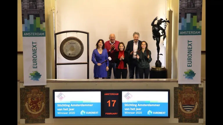 Merel Huizinga, Amsterdammer van het jaar 2020, luidde de gong ter viering van de Amsterdammer van het jaar 2020 verkiezing.