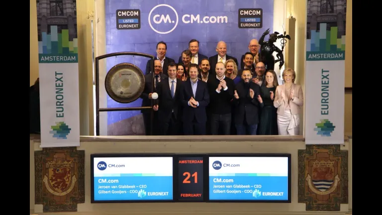 Jeroen van Glabbeek, CEO en mede-oprichter van CM.com, markeert de start van de eerste handelsdag van CM.com op Euronext Amsterdam met een slag op de gong.