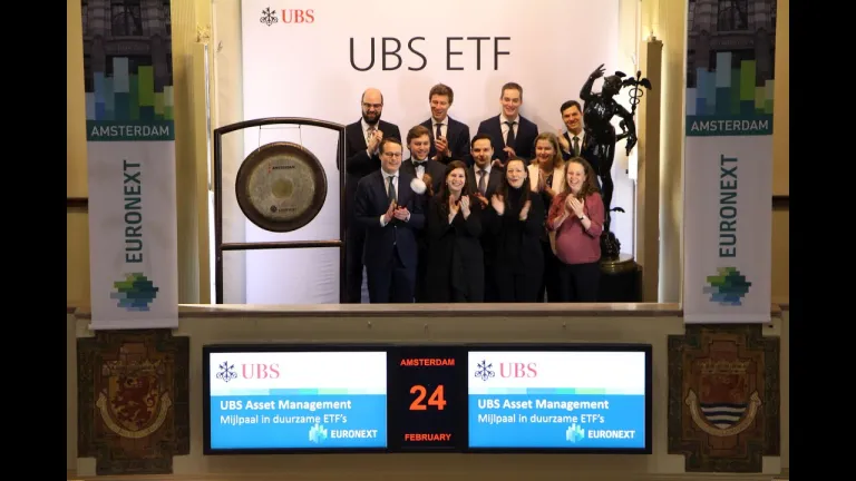 Marcel Danen, Hoofd Passief & ETF specialist Sales Benelux, luidde de gong om te vieren dat UBS Asset Management de mijlpaal van meer dan 10 miljard euro aan beheerd vermogen in haar duurzame ETF-familie heeft behaald.