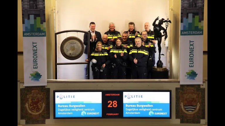 Euronext bedankt vandaag de agenten van politiebureau Burgwallen. Zij werken dagelijks aan het veilig houden van het centrum van Amsterdam, waaronder de winkelstraten Nieuwendijk/Kalverstraat, de Dam, de Nieuwmarktbuurt en het Wallengebied. Wijkagente Corinne Kouwenberg luidt de gong.