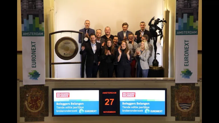 Redacteur Jeff Thijssen van Beleggers Belangen heeft de gong geluid op Beursplein 5 in Amsterdam. Thijssen heeft de afgelopen maanden de tiende editie van het brokeronderzoek van Beleggers Belangen uitgevoerd. Dit is het onderzoek naar kosten, handelsmogelijkheden, service en gebruiksgemak van in Nederland actieve banken en brokers. Het onderzoek is 27 november gepubliceerd.