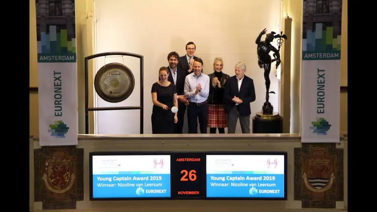 Nicoline van Leersum, Johsnon & Johnson Medical, winnaar van de Young Captain Award 2019, luidt de gong en opent daarmee de handel op de Amsterdamse beurs.