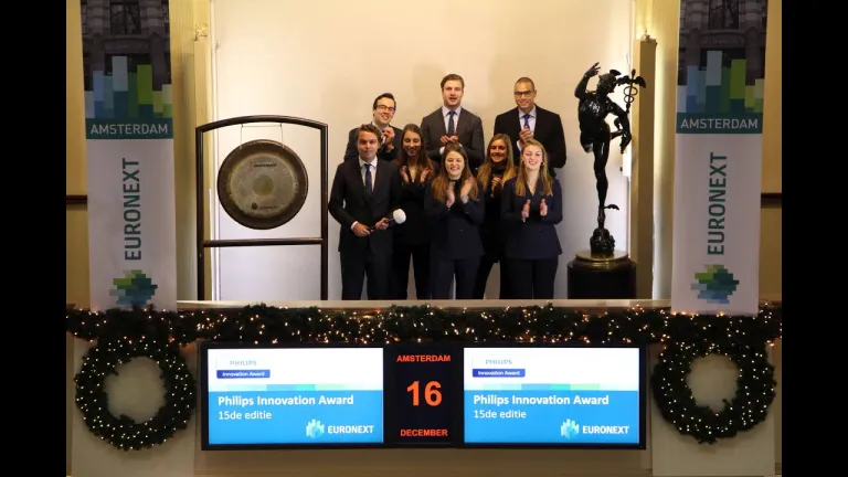 Het bestuur van de Philips Innovation Award opent de Amsterdamse Beurs door het luiden van de gong. Momenteel is de 15e editie van de grootste studenten ondernemers wedstrijd in Nederland aan de gang.