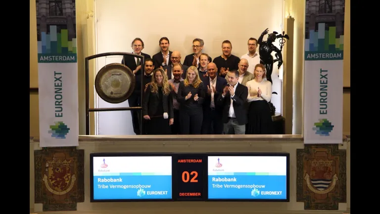 De Tribe Vermogensopbouw van de Rabobank heeft een nieuwe structuur, die de Rabobank beter in staat stelt klanten te bedienen op weg naar een financieel gezond leven en die een betere samenwerking met partners, zoals Euronext Amsterdam mogelijk maakt. De gong wordt geluid door Sandra Hurkmans-Stuut, productmanager Beleggen.