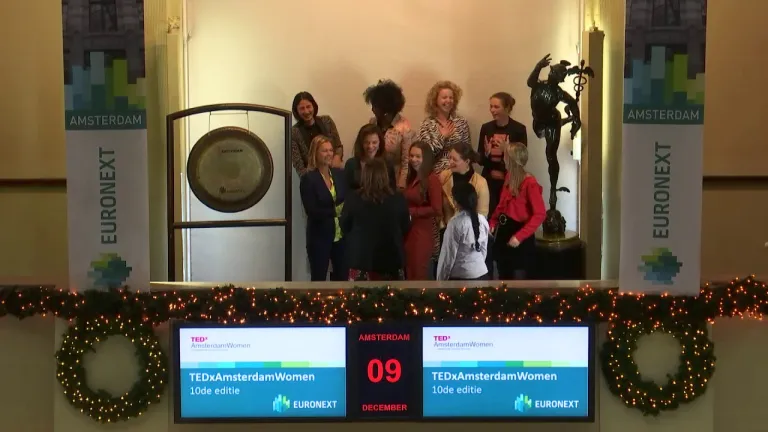 Carine de Meyere, Director TEDxAmsterdamWomen en de Startup Award 2019, opent vandaag de handel op de Amsterdamse beurs samen met het team TEDxAmsterdamWomen Organizing & Partnerships.
