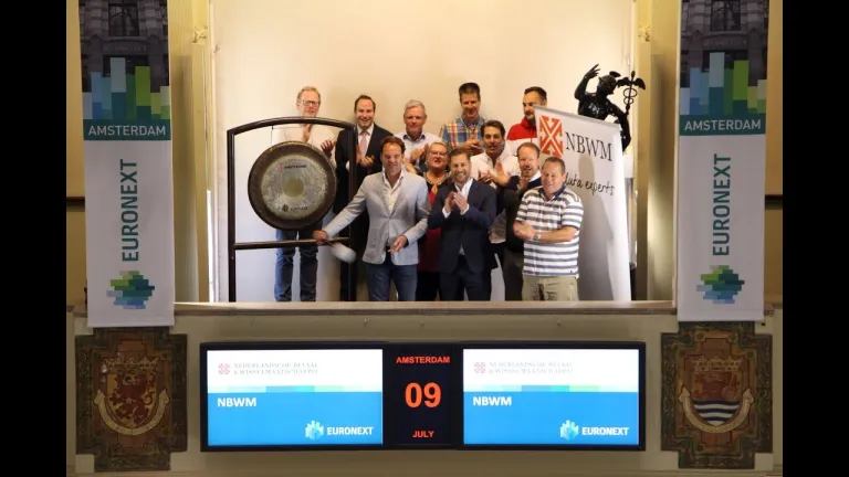 De Nederlandsche Betaal- en Wisselmaatschappij (NBWM.nl) beschikt sinds begin dit jaar over nieuwe kantoorruimte op het Beursplein 5. Ter ere daarvan luidt Joost Derks, algemeen directeur, de gong.