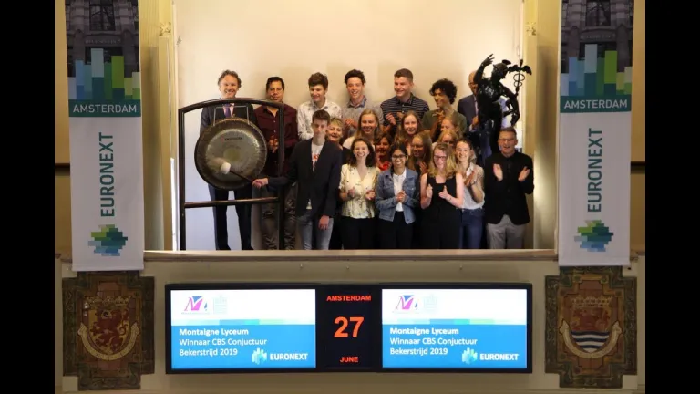 Vwo-leerlingen van het Montaigne Lyceum hebben dit schooljaar de ConjunctuurBekerStrijd 2019 gewonnen, de landelijke economiewedstrijd van het CBS. Ter ere daarvan mag Bram Boers de gongslag verrichten en daarmee de handel op de Amsterdamse beurs openen.
