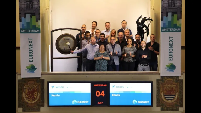 Kendu is een nieuwe app van ABN Amro (voor zowel klanten als niet-klanten) en is begin april 2019 gelanceerd. Om de lancering en de eerste successen te vieren opent Jeroen van Beest de handelsdag, samen met de rest van team Kendu.