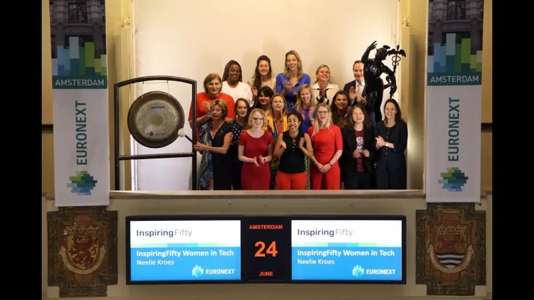 Neelie Kroes luidt de gong ter ere van de InspiringFifty women in tech lijst. InspiringFifty is een non-profitorganisatie die tot doel heeft de diversiteit in de technologiesector te vergroten door vrouwelijke rolmodellen zichtbaarder te maken.