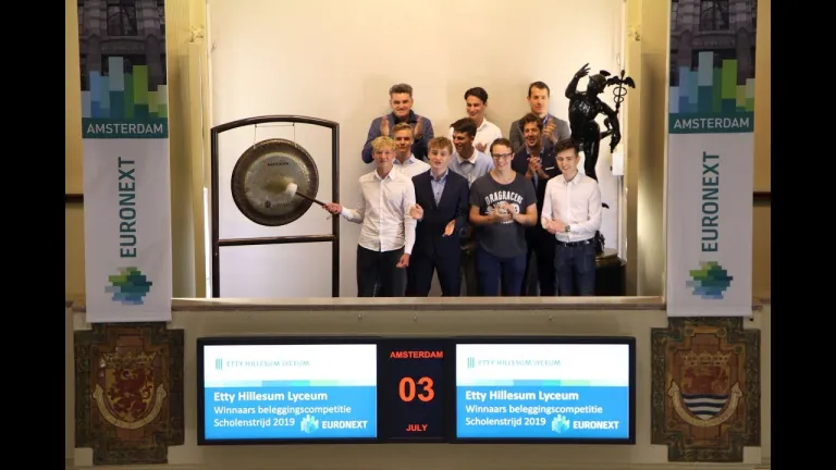 Leerlingen uit de Havo 5-klas Economie van het Etty Hillesum Lyceum uit Deventer luiden de gong van de als winnaars van de beleggingscompetitie Scholenstrijd. De leerlingen wonnen de prijs voor het beste rendement in het voorjaar 2019.