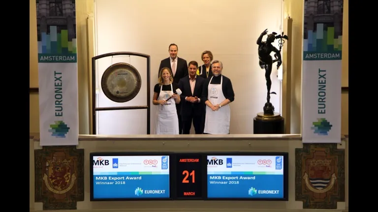 Leentjes Poeder Pret is uitgeroepen tot winnaar van de MKB Export Award 2018. Ter ere hiervan opent Marleen de Haan, DGA, de Amsterdamse Beurs.
