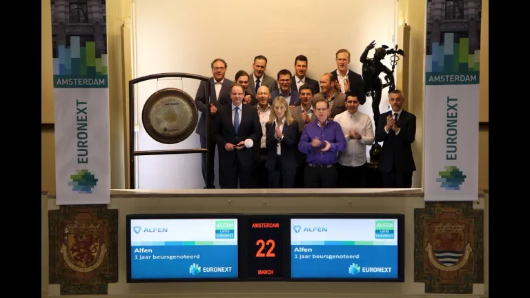 Ter gelegenheid van 1 jaar beursgenoteerd te zijn aan Euronext Amsterdam (handelssymbool; ALFEN) , luidt Jeroen van Rossen, Financieel Directeur, de gong.