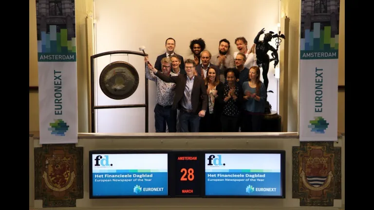 Het FD is ‘European Newspaper of the Year’ in 2018. Ter ere hiervan luidt Hans Spoelman, hoofd design, de gong.
