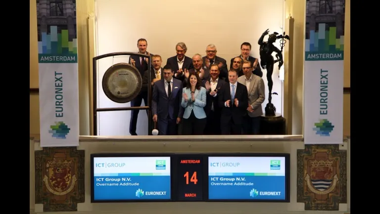 Sam Aston, Ceo van Additude AB Zweden, luidt ter gelegenheid van de overname door ICT Group, de gong. ICT Group is genoteerd aan de Amsterdamse Beurs (Handelssymbool; ICT)