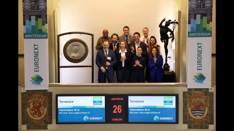 Heineken is sinds 1939 beursgenoteerd aan de Amsterdamse beurs. Ter viering luidt Federico Castillo, Hoofd Investor Relations, de gong.