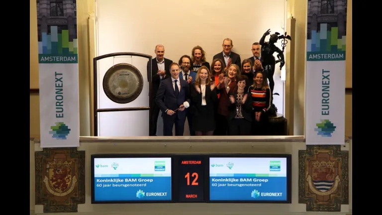 Koninklijke BAM Groep nv bestaat dit jaar honderdvijftig jaar en is zestig jaar genoteerd aan Euronext Amsterdam (Handelssymbool; BAMNB). Ter ere hiervan luidt Frans den Houter, CFO, de gong.