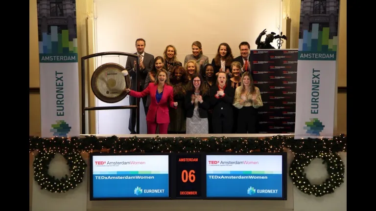 Carine de Meyere Director Partnerships TEDxAmsterdamWomen & de Startup award 2018, opent de handel op de Amsterdamse beurs. Carine deelt het podium met het TEDxAmsterdamWomen team en een groot aantal partners waaronder ABN AMRO, NN, Accenture, Cathay Pacific Clifford Chance, Aon, Allen & Overy, Facebook, Boeing, Salesforce, Philips en Microsoft.