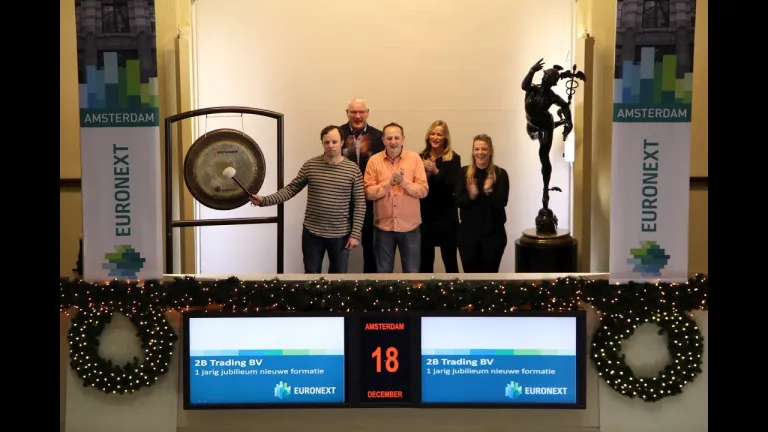 Han Zwakenberg en Jeroen de Bruin zijn beiden al lang actief op de beurs als handelaar bij verschillende professionele partijen. Sinds een jaar werken zij samen als 2B Trading BV. Ter ere van dit jubileum luiden zij de gong