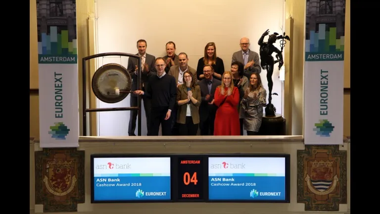 ASN Bank biedt volgens particuliere beleggers de beste duurzame producten. Daarom won de bank in november de Cashcow Award in de categorie Beste Aanbieder Duurzame Producten. Om dat te vieren opende productmanager Ingmar Soek de handel op Beursplein 5.