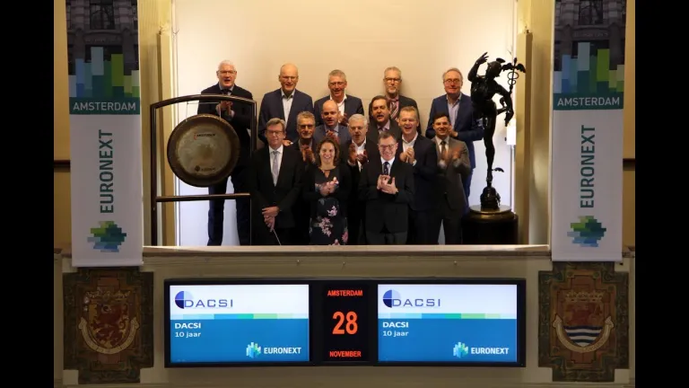 DACSI (Dutch Advisory Committee Securities Industry) bestaat tien jaar en viert dat met een gongslag. Voorzitter Henk Brink, werkzaam bij KAS BANK, van de vereniging DACSI opent de markt.