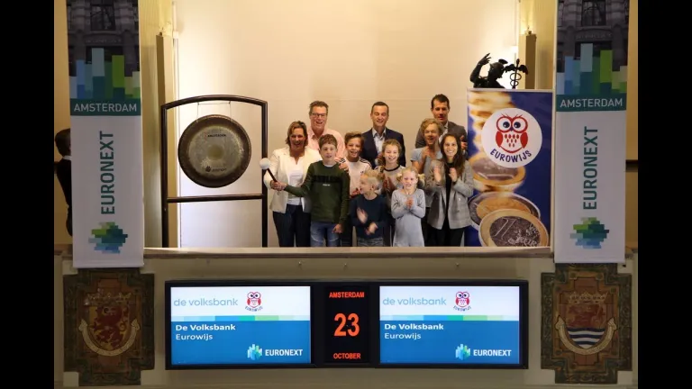 Met een slag op de gong opent initiatiefneemster Hilde Krens van Eurowijs vandaag de handel op de Amsterdamse beurs om het 5 jarig bestaan te vieren. Zij doet dit samen met 6 leerlingen uit het basis- en middelbaar onderwijs. Met Eurowijs leren kinderen in het basisonderwijs en de onderbouwgroepen van het middelbaar onderwijs hoe ze om moeten gaan met geld. Inmiddels wordt het Eurowijs lesmateriaal gebruikt op 1 op de 3 basisscholen, met een bereik van ruim 220.000 leerlingen. Amsterdam en omstreken neemt hiervan bijna 10% voor haar rekening.