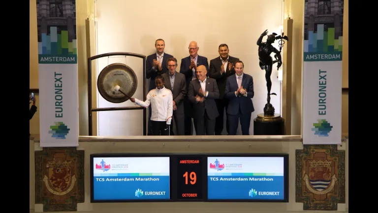 Le Champion en NN openen samen de beurs als startsein voor de TCS Amsterdam Marathon die plaatsvindt op zondag 21 oktober. Tadelech Bekele, atleet van het NN Running Team, sloeg hiervoor de gong. NN is sponsor van de TCS Amsterdam Marathon, waaraan 45.000 hardlopers meedoen.