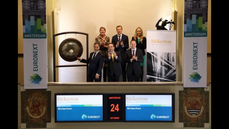 Bickerton, een onafhankelijk strategisch corporate communicatiebureau opent vandaag de handelsdag op Euronext Amsterdam. De gongslag markeert de start van het nieuwe Nederlandse communicatiebureau Bickerton. Zij richten zich voornamelijk op strategische corporate communicatie.