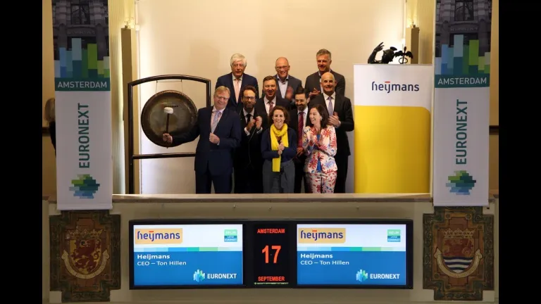 Ton Hillen, CEO van Heijmans, luidt de gong om de beurshandel op Euronext Amsterdam officieel te openen. Het bedrijf is opgericht in 1923 en is deze week 25 jaar beursgenoteerd.