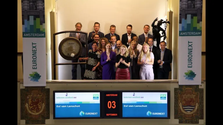 Evi van Lanschot viert deze maand haar vijfde verjaardag. Ter ere van deze mijlpaal opent Doryne Bouwman, senior vermogenscoach bij Evi, de beursdag op Euronext Amsterdam met de traditionele slag op de gong.