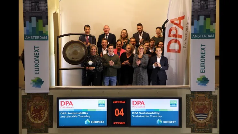 Leonie Jesse, directeur van DPA Sustainability, opent de beurs met de traditionele slag op de gong. DPA (ticker symbol: DPA) vraagt hiermee aandacht voor Duurzame Dinsdag en het belang van duurzaamheid in het algemeen.
