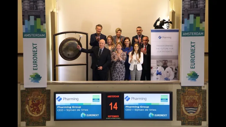 Sijmen de Vries, CEO van de op Euronext genoteerde Pharming Group (ticker symbol: PHARM) luidt de gong op de Amsterdamse beurs. Pharming Group viert zijn eerste halfjaar van netto winstgevendheid en de opening van zijn regionale non-deal retail investor roadshow.