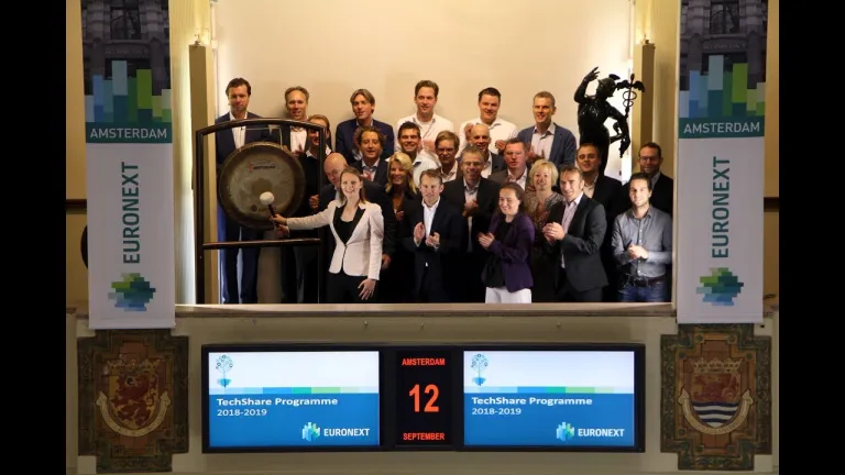 Als start van de vierde editie van het Euronext TechShare programma – 2018-2019 luiden de nieuwe Nederlandse deelnemers en partners van dit seizoen de gong. TechShare is een educatieprogramma speciaal gericht op snelgroeiende en innovatieve techbedrijven, die meer willen weten over het proces rondom een beursgang. Het programma helpt eigenaren en bestuurders van techbedrijven om de functie en dynamiek van de financiële markten beter te begrijpen. CEO’s van de deelnemende partijen zijn zo beter in staat om de mogelijkheden van een beursnotering en de kansen ervan te beoordelen in relatie tot hun strategie en groeiambities.