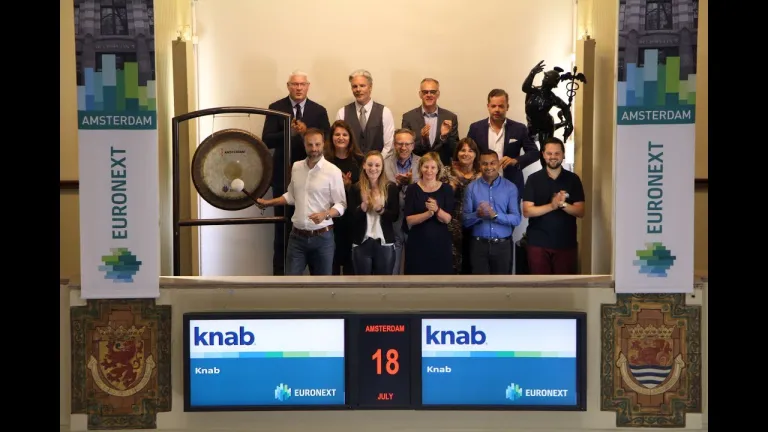 Knab luidt de gong op de Amsterdamse beurs van Euronext en opent hiermee de handelsdag. Stephan Vinkenborg CTO IT van Knab luidt de gong. Knab viert dat het in 4 jaar tijd is uitgegroeid tot de populairste bank onder zzp’ers.