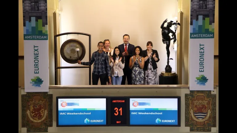 Ambassadeurs van IMC Weekendschool luiden de gong om de handel te openen op de Amsterdamse beurs. Op 10 juni wordt de derde lichting bestaande uit tien ambassadeurs beëdigd tijdens de ‘Heroes Day’.