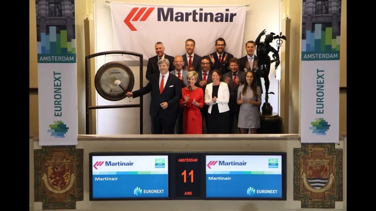 Martinair viert haar zestigjarig bestaan met een slag op de gong. Marcel de Nooijer, Managing Director Martinair Holland N.V., opent met het luiden van de gong de handelsdag op de Amsterdamse beurs van Euronext.