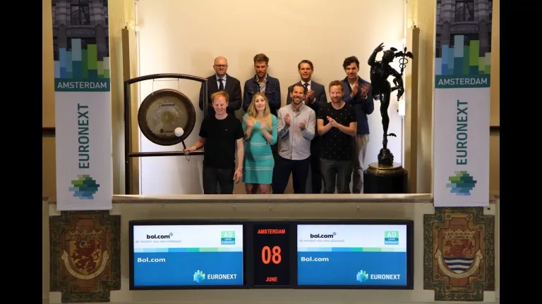 Het Social Hub Team van Bol.com luidt de gong op de Amsterdamse beurs van Euronext. Daarmee viert de webwinkel het winnen van twee Best Social Awards.