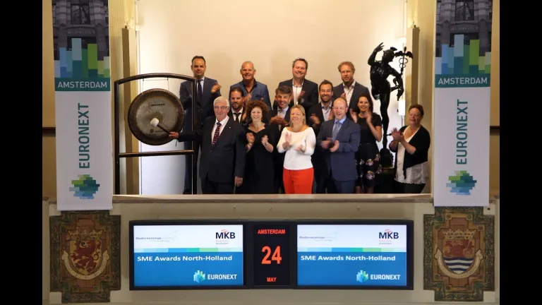De winnaars van de Ondernemingsverkiezing Noord-Holland (OVNH) openen samen met MKB Noord-Holland en de stuurgroep leden van de OVNH de Amsterdamse beurs van Euronext.