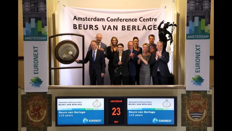 Om haar 115-jarige jubileum te vieren opent Wienke Bodewes, Algemeen Directeur AMVEST, Voorzitter van de aandeelhoudersvergadering Beurs van Berlage, de handelsdag in Amsterdam met een slag op de gong.