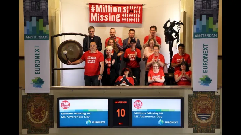 De Nederlandse organisatoren van de wereldwijd georganiseerde campagne MillionsMissing openen met een slag op de gong de beurs in Amsterdam. Zo slaan ze symbolisch alarm voor de onder financiering van onderzoek naar de ziekte Myalgische Encefalomyelitis (ME).